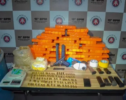Os PMs encontraram uma pistola 380, carregadores, 117 munições, duas balanças e uma câmera de monitoramento clandestino. Além disso, foram apreendidos também 39 tabletes de pasta base de cocaína, porções da mesma droga e maconha, que equivalem a uma quantidade total de quase 40 quilos.