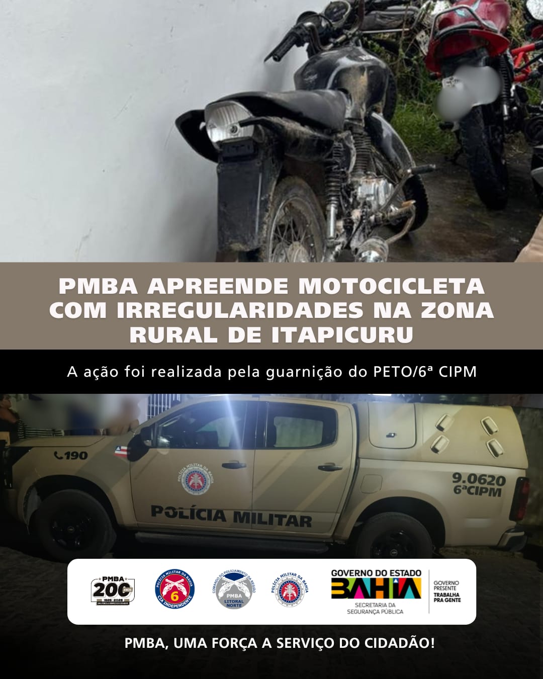 Na madrugada desta quinta-feira, 2/10, a guarnição do PETO/6ª CIPM apreendeu um motocicleta, no povoado Candeal II, em Itapicuru.