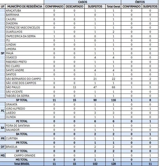 No comunicado, o ministério afirmou que há 113 registros de intoxicação por metanol, segundo os dados enviados pelas secretarias estaduais. Destes, 11 estão confirmados, enquanto os 102 restantes estão em investigação. Até o momento, 12 pessoas morreram sob a suspeita de intoxicação.