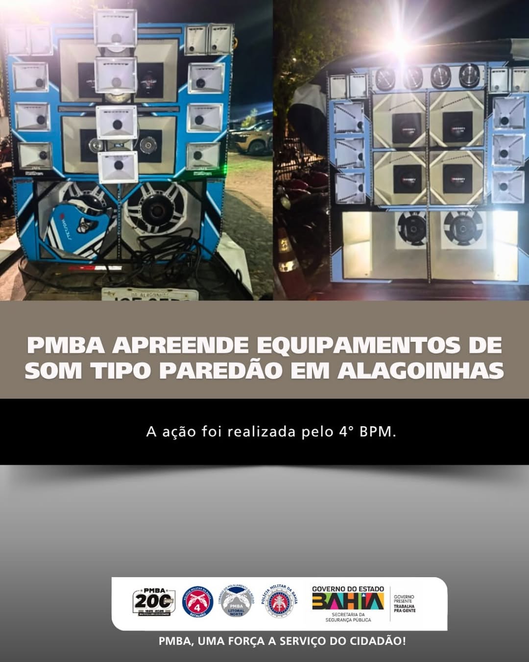 Policiais militares do 4º BPM apreenderam equipamentos de som tipo “paredão” no Loteamento Santa Terezinha, em Alagoinhas, após denúncia de perturbação do sossego público.