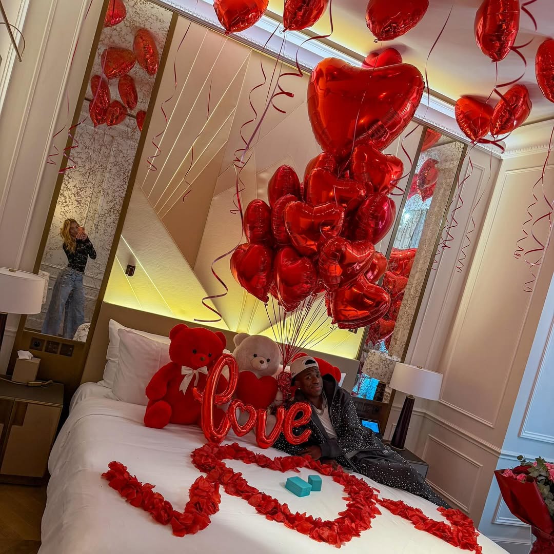 O jogador de futebol Vini Jr surpreendeu os seguidores ao publicar uma série de fotos de uma surpresa feita para a influenciadora Virginia Fonseca. As imagens foram publicadas por ele, em colaboração com o perfil dela, na manhã desta terça-feira (28).Nas fotos, os dois aparecem em clima de romance, no que parece ser um quarto de hotel, totalmente decorado com balões vermelhos, pétalas de rosas em formato de coração e duas caixas de joias, que parecem ser anéis. Ainda existe a palavra “amor”, em balões, escrita em inglês.