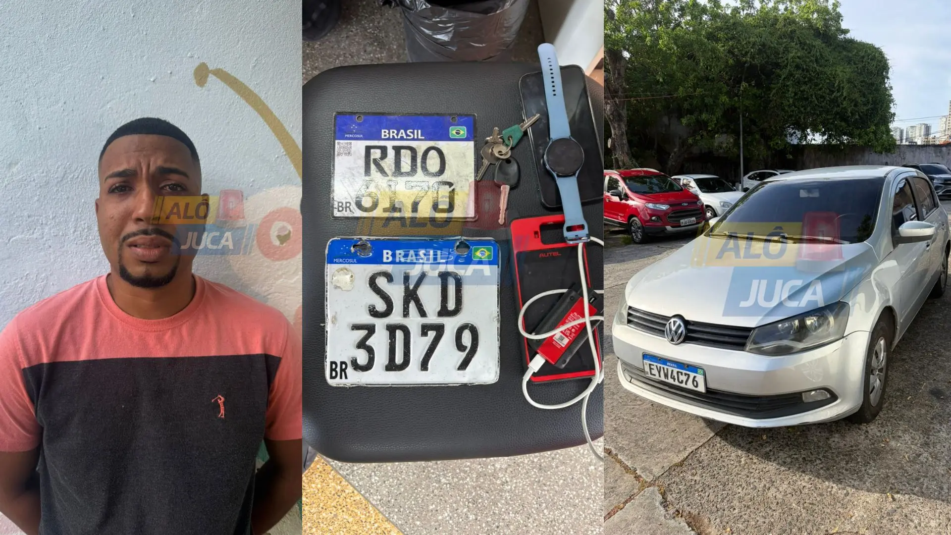 O suspeito estava em um Volkswagen Novo Gol 1.0 City, de cor prata, ano modelo 2013, ano de fabricação 2012, sem restrição no sistema, mas, ao revistarem o veículo, os policiais encontraram um aparelho eletrônico utilizado para furtos de automóveis, além de placas veiculares, uma chave de outro carro e um celular. O equipamento apreendido é comumente usado por criminosos para burlar sistemas de segurança e facilitar a subtração de veículos.