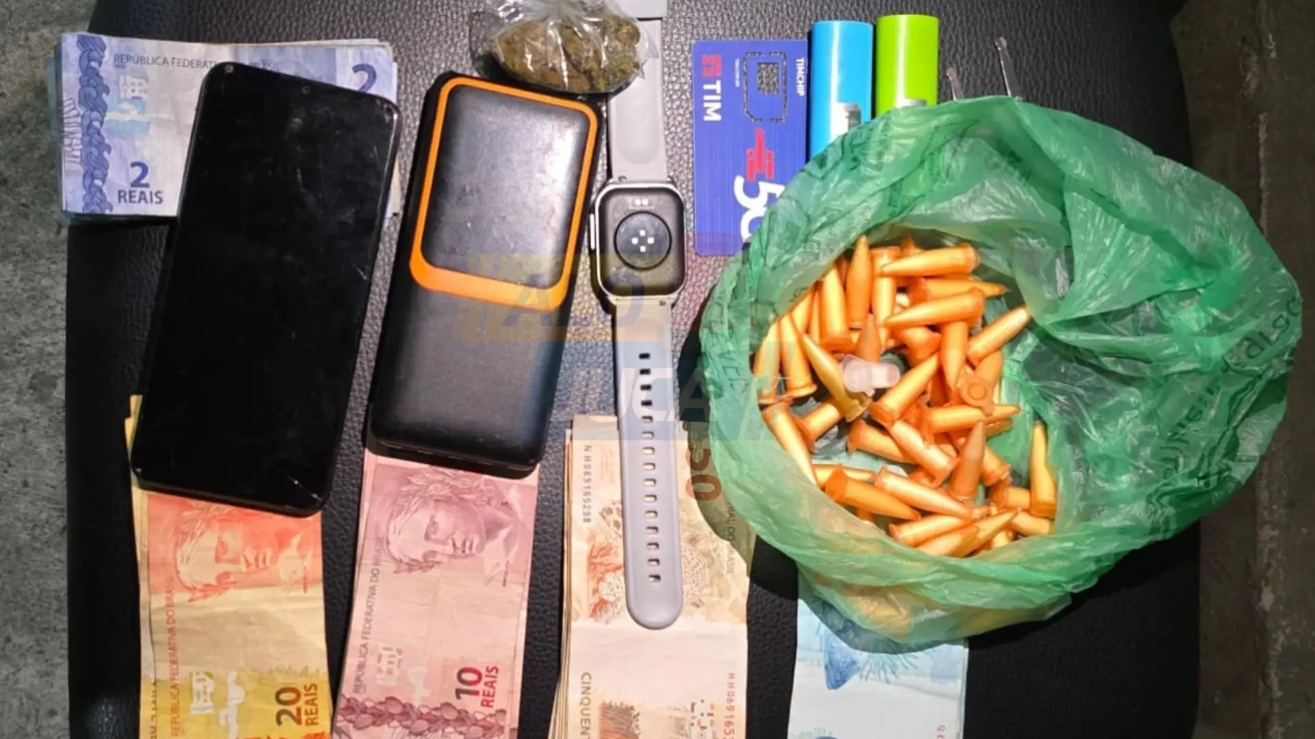 Com o detido, os policiais apreenderam 53 pinos de cocaína e uma porção de maconha. Além dos entorpecentes, foram confiscados R$ 2.032,00 em espécie, dois isqueiros, duas tesouras, um relógio e um aparelho celular.