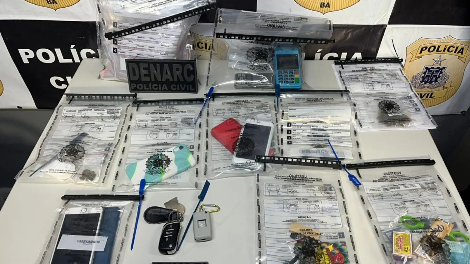 Durante o cumprimento de sete mandados de busca e apreensão, investigadores do Denarc localizaram porções de maconha, cocaína e drogas sintéticas. Além dos entorpecentes, a polícia apreendeu dois veículos, balanças de precisão e materiais utilizados para embalar e vender as substâncias.